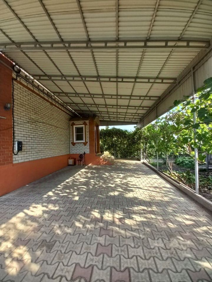 Двор большой, под навесом, устелен тротуарной плиткой, имеется машино-место. Территория огорожена металлопрофильным забором с распашными воротами, фасадная часть забора с кирпичными столбами. Удобный подъезд к дому: просторная придомовая территория.