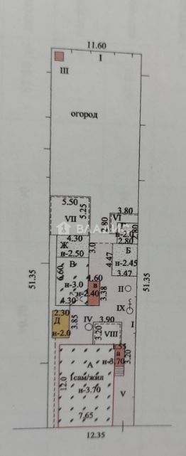 Участок правильной формы: фасад 12,3 метра, 51,3 метра в длину. Отмежеван, огорожен по периметру.