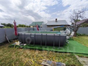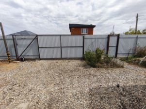 Двор огорожен забором из металлопрофиля, автоматические откатные ворота, бассейн, забетонированы столбы для беседки, высажены плодоносящие деревья.
