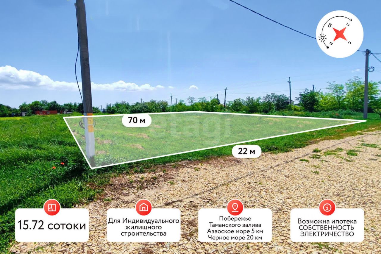 Участок расположен в районе, который густо застроен частными домами. В 2 минутах проходит дорога ведущая в центр поселка, развилки на Краснодар, Анапу и Крым, что обеспечивает хорошую транспортную доступность, в дали звуков проезжающих машин.