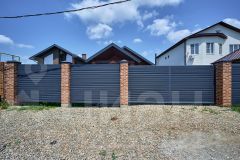 Забор по периметру - евроштакетник, ворота откатные из сайдинга на пульте управления.