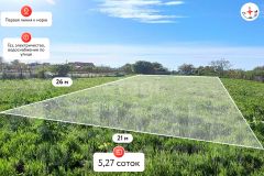 Категория земли:для целей ведение личного подсобного хозяйства (ЛПХ). Фасад земельного участка 21м ,глубина 26 м. Участок находится в экологически чистом районе. Рядом находятся жилые дома. Все коммуникации : газ, вода, свет проходят по улице . Первая линия к морю.