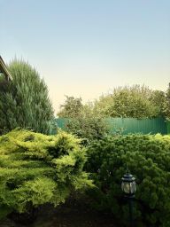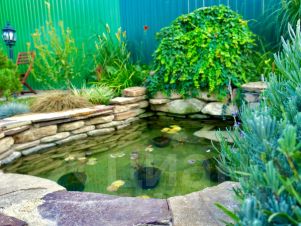 Большая ухоженная территория с зелеными насаждениями, декоративным прудом и зоной для барбекю на заднем дворе.
