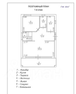 Планировка: холл 12,6 кв.м, гостевая спальня 13,5 кв.м, санузел 6 кв.м, кладовая, кухня-гостиная 26 кв.м с выходом на крытую просторную террасу 16 кв.м, лестница на второй этаж монолитная.