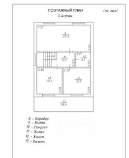 На втором этаже — холл, 5 кв.м, совмещенный санузел, три изолированные спальни, одна из которых 26 кв.м, из двух других спален — выход на ленточную лоджию-террасу 16 кв.м.