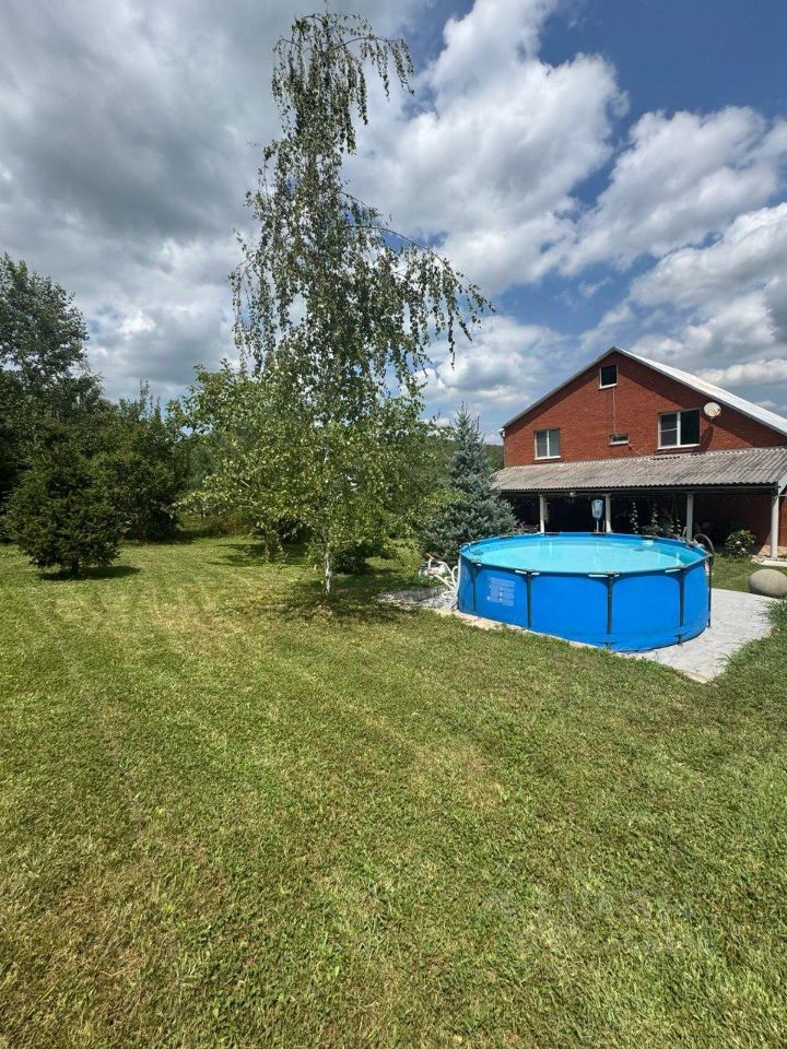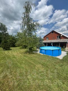 • На заднем дворе навес, терраса, лужайка, каркасный бассейн