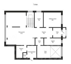 Планировка первого этажа включает в себя: кухню-гостиную с выходом к подогреваемому бассейну, спальню, гардероб, сан.узел, кладовую, теплогенераторную и гараж.