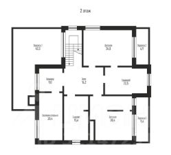 На втором этаже 2 спальни с выходами на отдельные террасы, гардеробная, гостевая спальня и просторная терраса 42,3 метра.