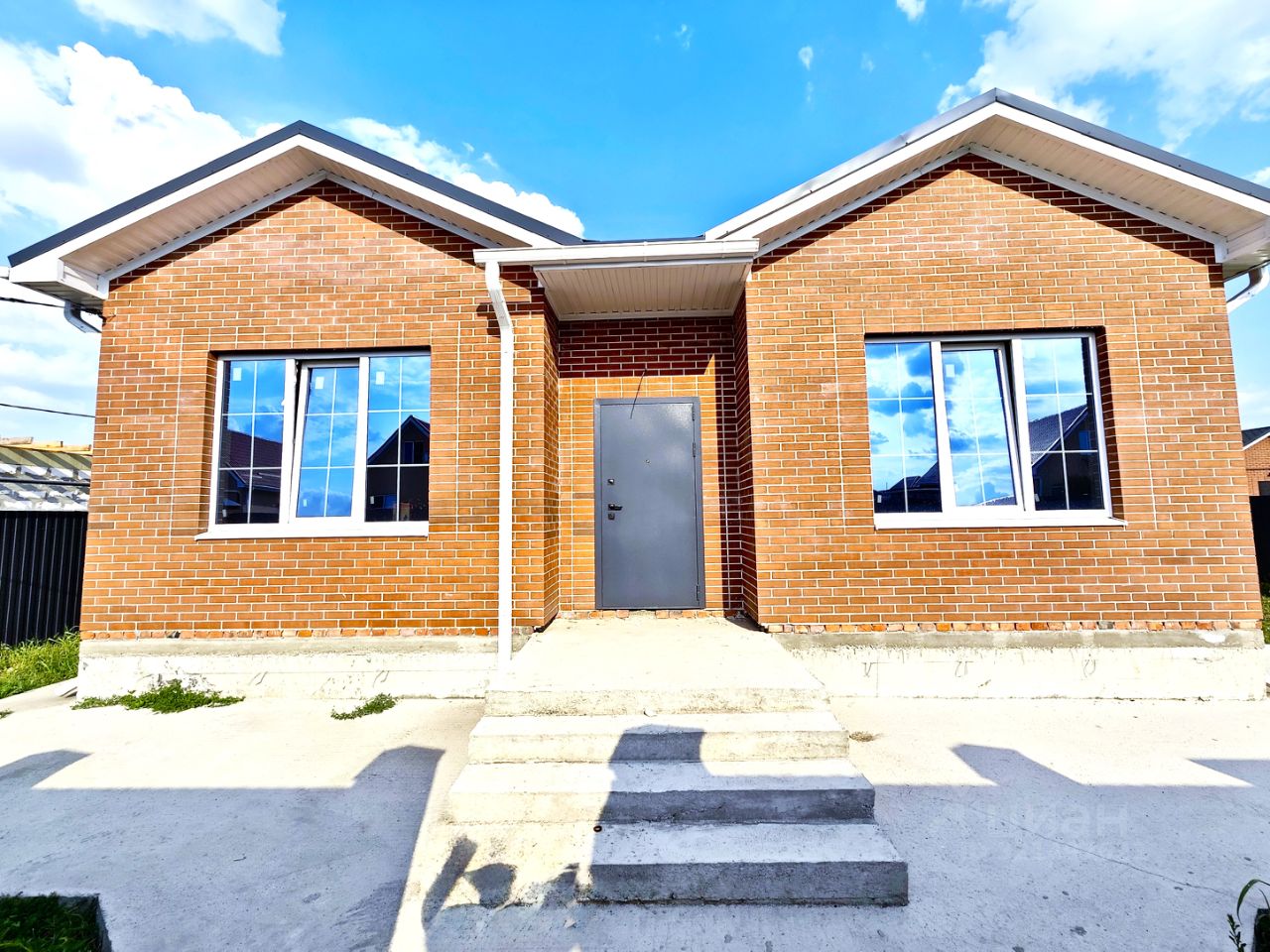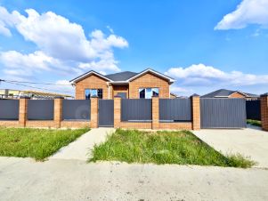 Одноэтажный коттедж возведен на сайно-ростверковом фундаменте, материал стен — газоблок, наружные — керамиечский кирпич, металлопластиковые окна с декоративной раскладкой, кровля — металлочерепица, входные двери.