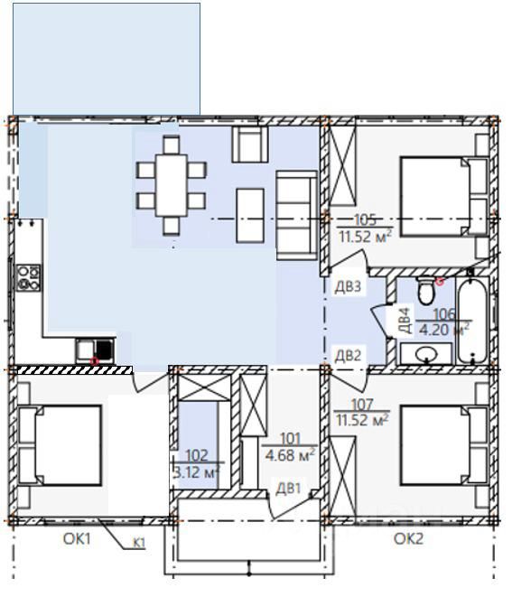 Планировка: 3 спальни, кухня-гостиная, санузел с ванной, терраса