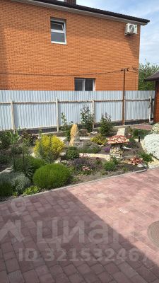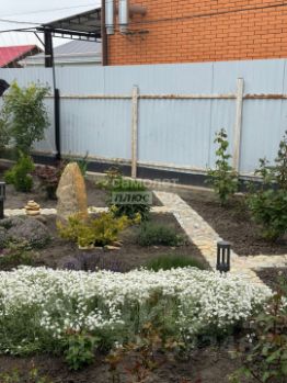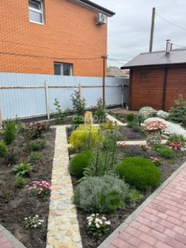 Двор выложен брусчаткой , на участке высажено много цветов, молодой фруктовый сад.