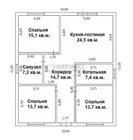 В доме: три изолированные спальни хорошей квадратуры, санузел, просторная кухня - гостиная с выходом на террасу , котельная, коридор.