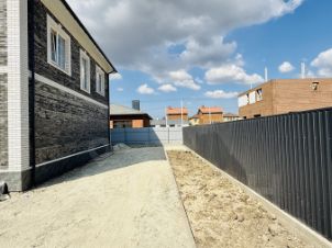 По периметру капитальный забор — штакетник на кирпичных колоннах