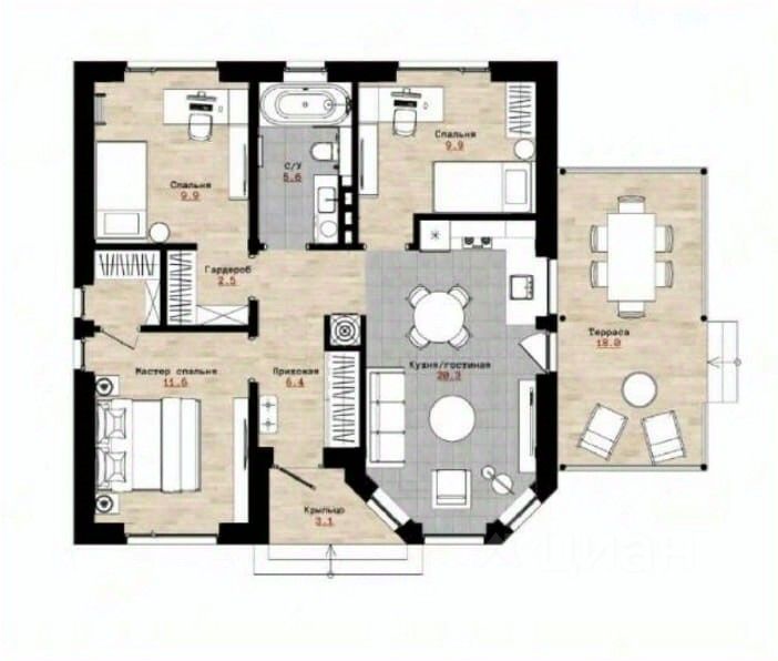 - Просторная площадь: Общая площадь составляет 108 квадратных метров, включая просторные комнаты и удобные зоны отдыха.