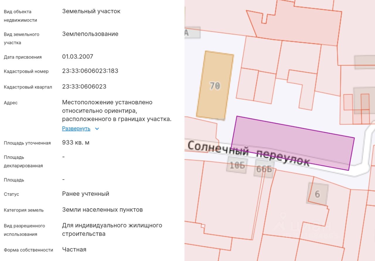 Земельный участок ИЖС 933 кв.м., ровный, прямоугольный (62,2м. 15 м.). Смежные соседи отсутствуют, есть возможность прирезки (увеличения площади). Транспортная доступность: асфальтированная дорога. Вода, канализация возле участка. Подведено электричество 15 кВт (3 фазы). Есть разрешение на строительство и разрешение на отклонение от предельных параметров допустимого строительства ( 1 метр от границы участка). 900 м. от моря. Подойдет для коммерции (магазины, кафе, гостевой дом и т.п.).