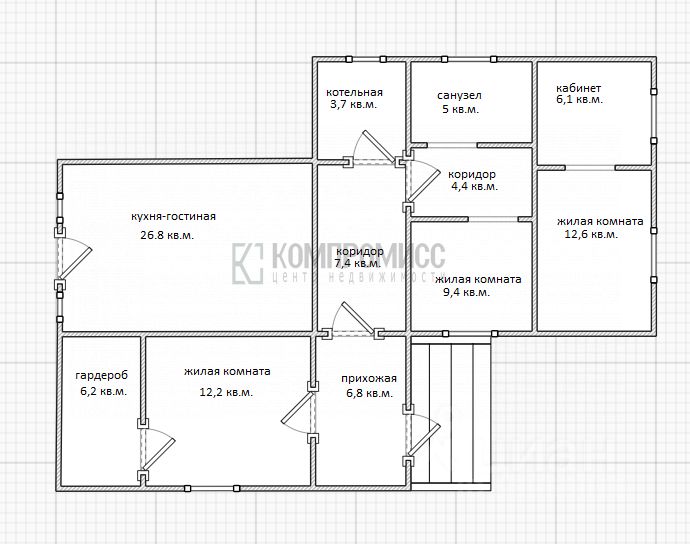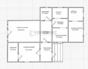 В доме- 3 изолированные жилые комнаты (в одной из спален с гардеробной, в другой с кабинетом), кухня-гостиная, прихожая, коридор, котельная, совмещенный санузел.