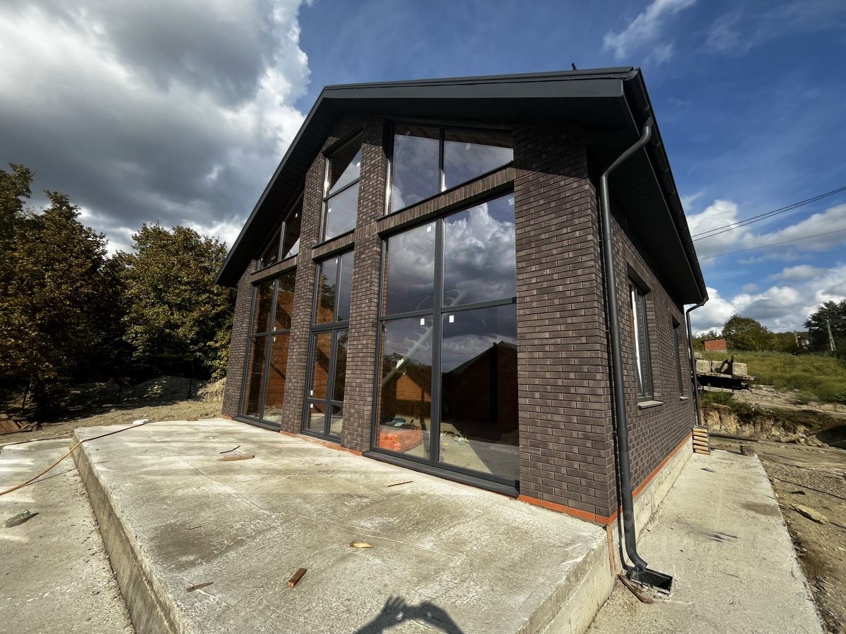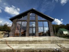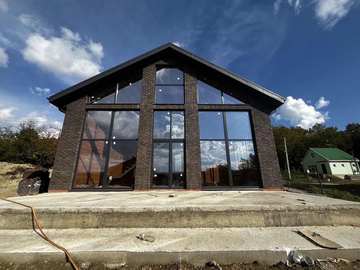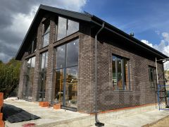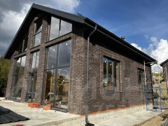 Дом внешне облицован клинкерным кирпичом темного цвета.