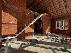 В доме два этажа, на первом - 2 спальни по 15 кв.м , с большими окнами, сан.узел 7,7 кв.м с окном и большая кухня-гостиная 41 кв.м., которая имеет витражное остекление с красивым видом на горы.