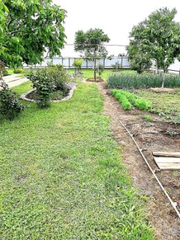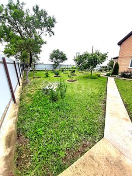 На участке высажены плодовые деревья: абрикос, вишня, черешня, яблоки и другие, посажены цветы и хвойные деревья, сделаны бетонные садовые дорожки.