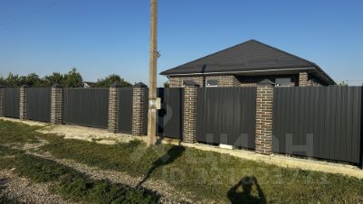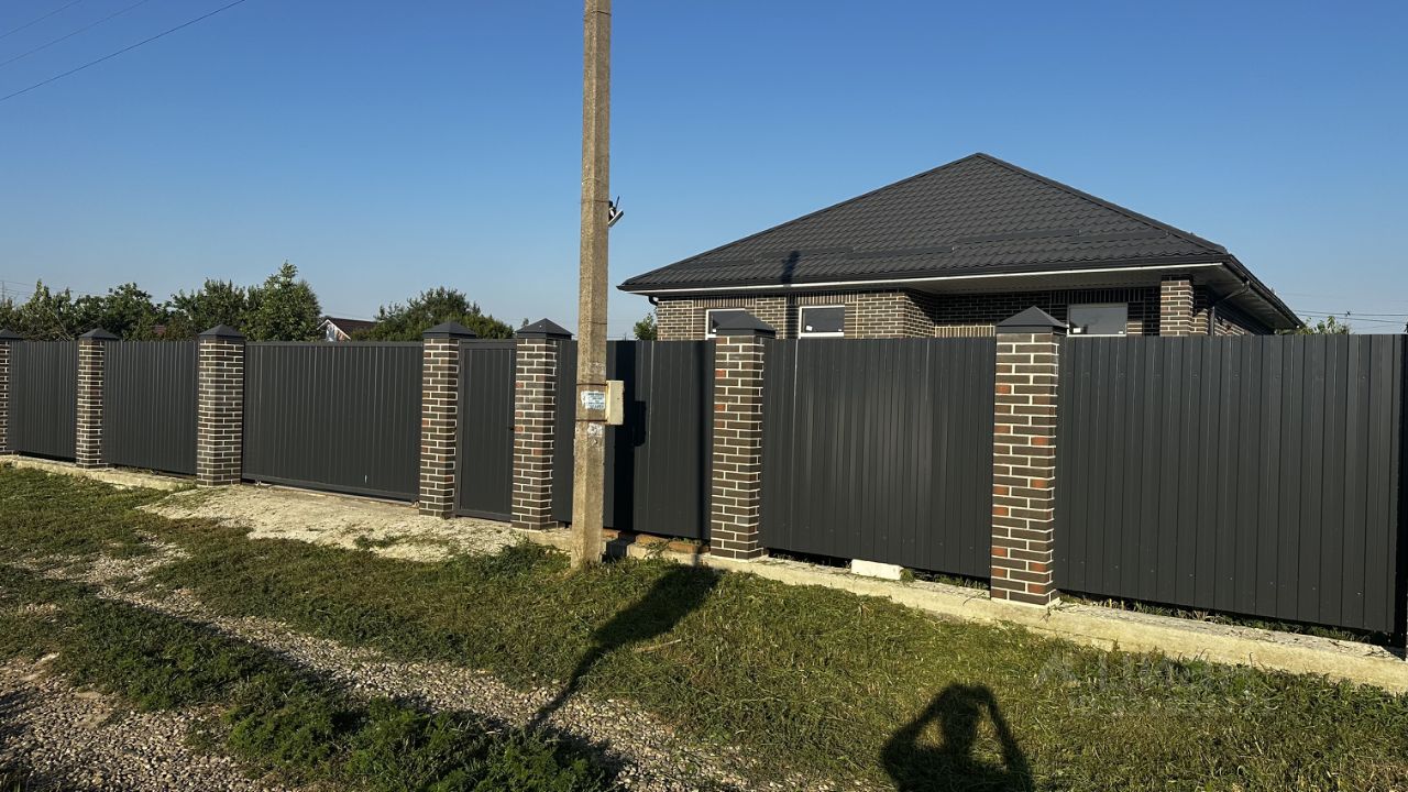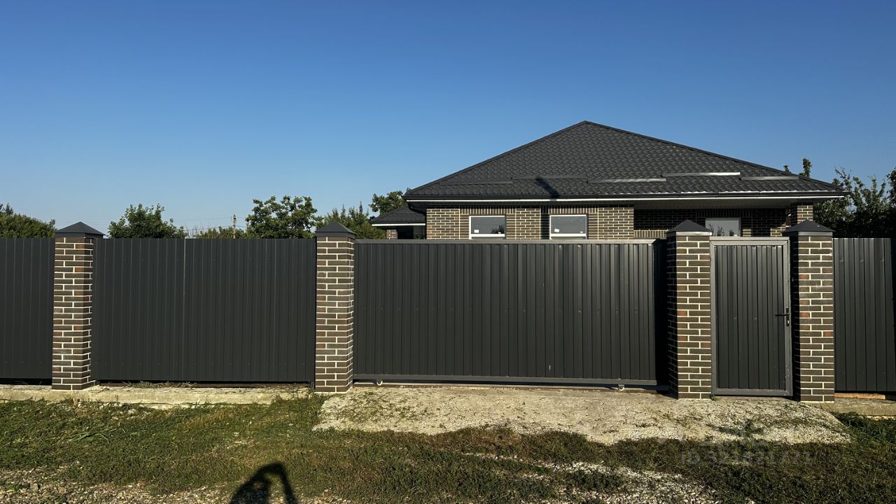 Вокруг дома залиты отмостки и площадка под два авто. Забор- колонны из кирпича и металлопрофиль. Ворота - откатные.