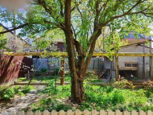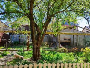 Есть садик с плодоносящими фруктовыми деревьями и розами.