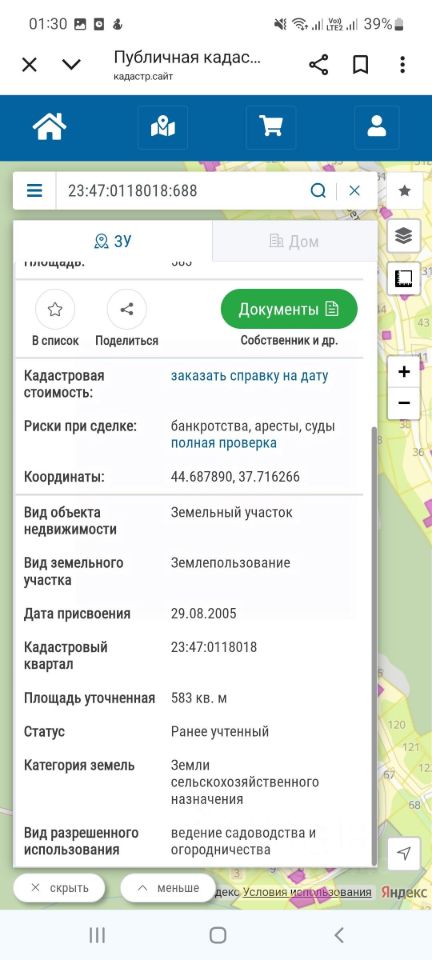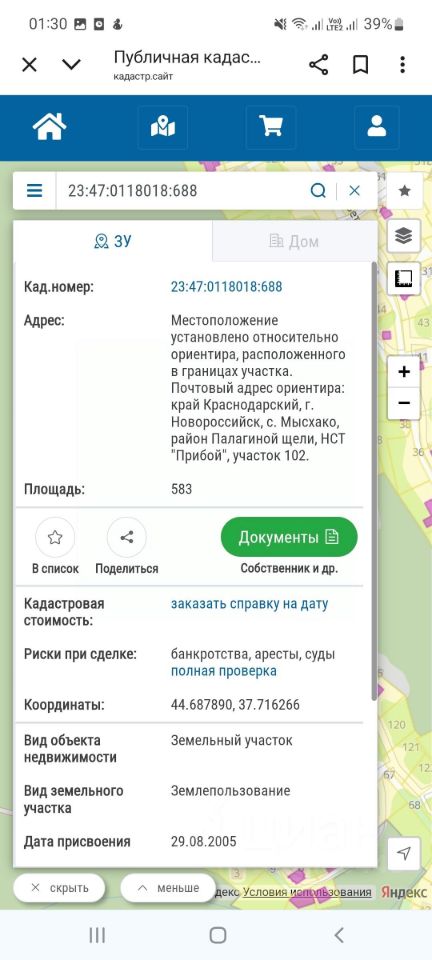 Участок 102 в с.Мысхако в СНТ Прибой от собственника (один собственник с 2008 г.). Кадастровый номер 23:47:0118018:688. Хорошее расположение и виды, подьезд (тупиковая тихая улица). На соседнем участке стоит новый дом. Можно строиться прописываться и т.д. Документы готовы. (Продаю еще 2 других участка в Прибое 6.15 и 10 соток по 450 тыс.р. сотка. В профиле видны все 3 обьявления)