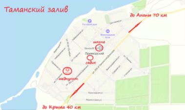 На автомобиле до Чёрного моря (пос. Веселовка) 35 км, до Темрюка 48 км, до Краснодара - 186 км.