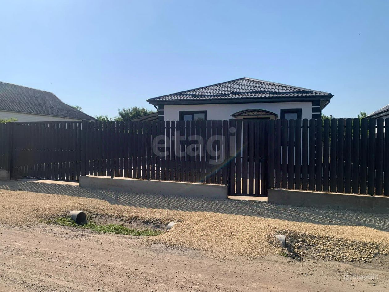 Дом построен из бетонного блока, дополнительно утеплён пеноплексом 8 и выполнена штукатурка короедом. Крыша из качественной металлочерепицы. Над входной дверью установлен козырёк. Так же на участке имеется навес над террасой примыкающий к соседнему участку. Во дворе забетонирована площадка под машиноместо и дорожка к входной двери. Фасад дома металлический штакет, установлена калитка и откатные ворота.