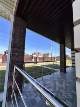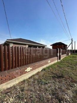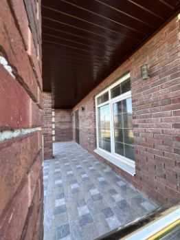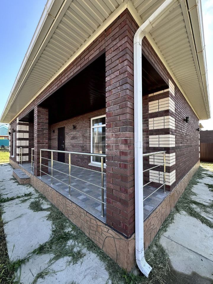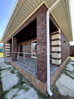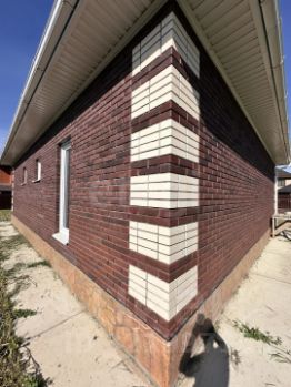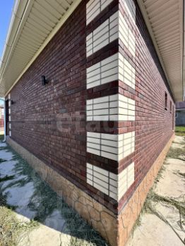 Дом облицован керамическим кирпичом. Во дворе сделаны дорожки бетонные, по всему периметру забор из кирпичных колонн.
