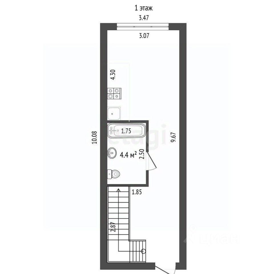Двухэтажный таунхаус . Полноценные потолки 3 м на первом и втором этаже .