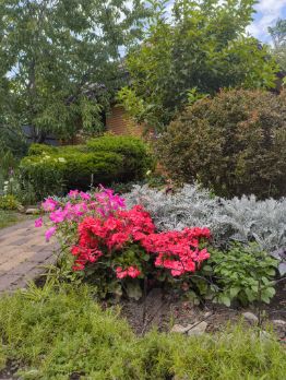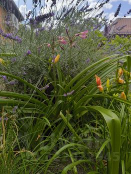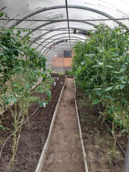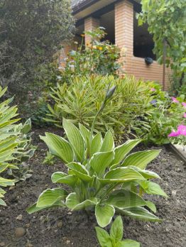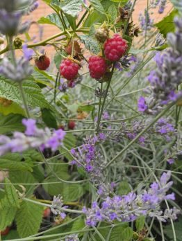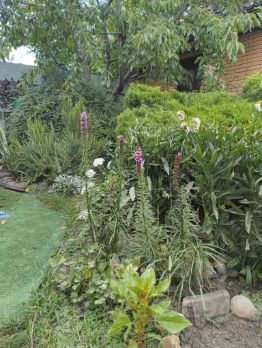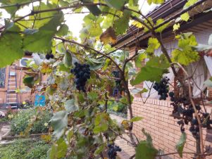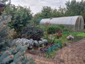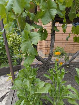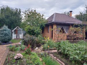 --- Сад фруктовых деревьев : 3 черешни, 3 яблони, 2 абрикоса. Кустарники : черная и красная смородина, крыжовник , малина 3 сорта, виноград 2 сорта. Клубника