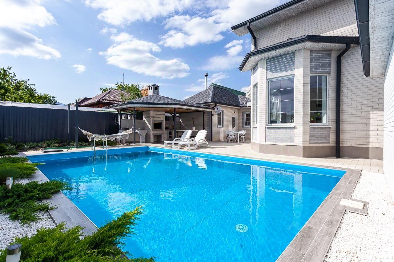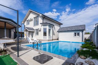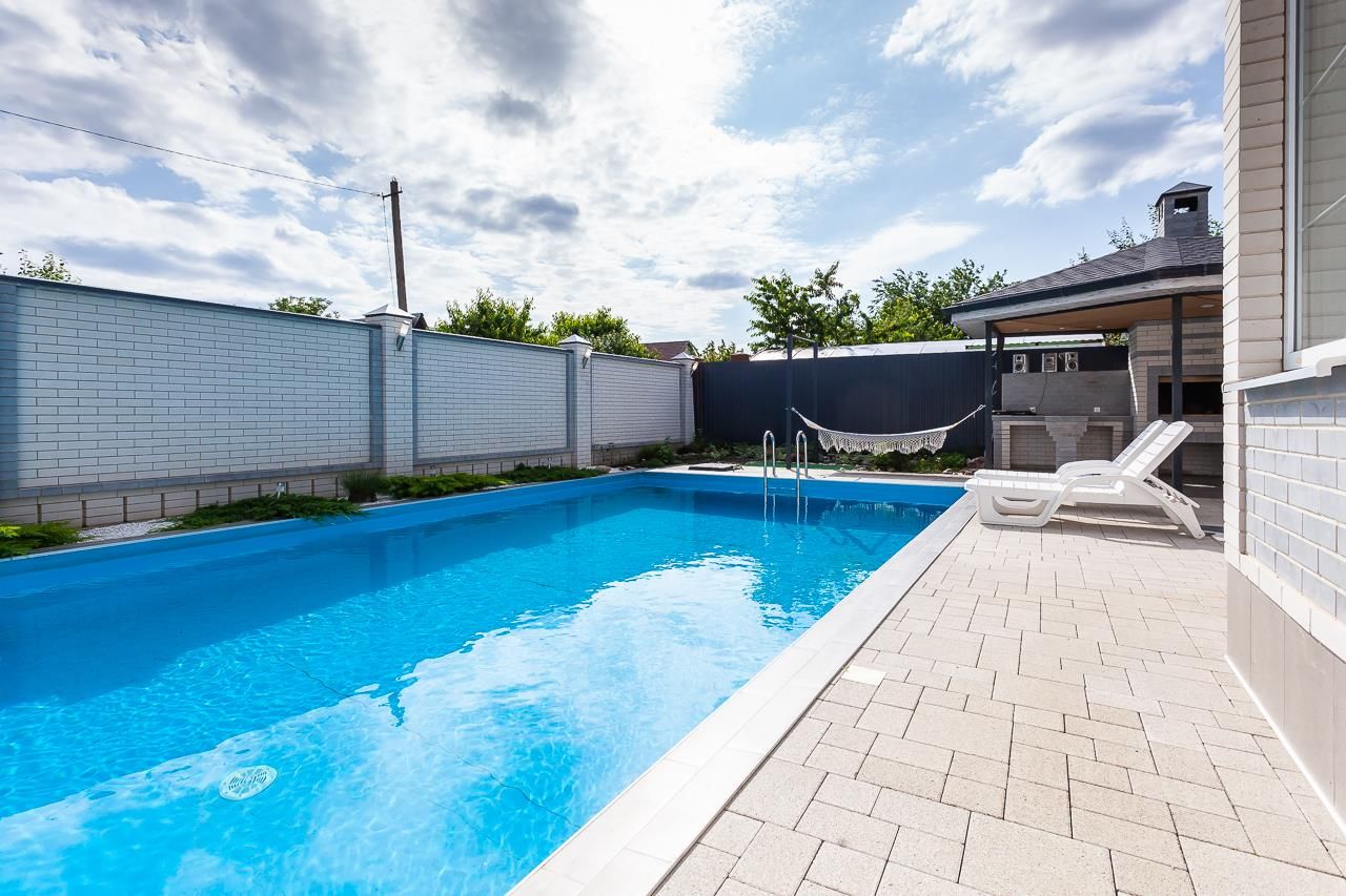 Грамотное размещение дома на участке, позволило оставить место для бассейна, поверхность которого обтянута импортной плёнкой, установлена Испанская фильтрационная система.