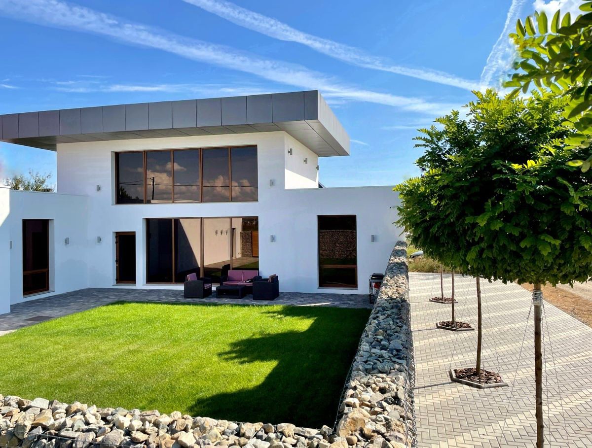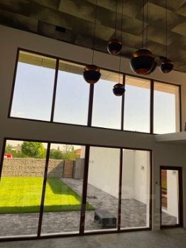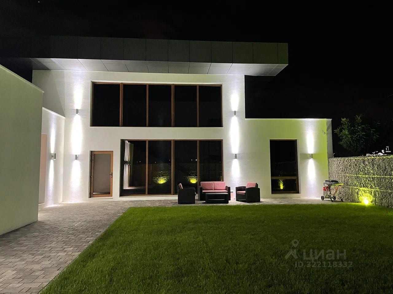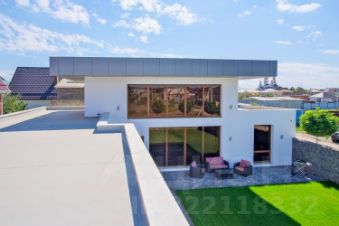 Архитектура дома выполнена в стиле минимализм с витражным остеклением и