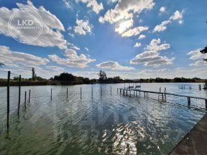 Усадьба с выходом на берег реки. На берегу навес из металлопрофиля. Берег выложен тротуарной плиткой и ракушечником. Имеется мостик с лестницей в воду и площадка с навесом для рыбалки.