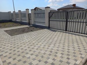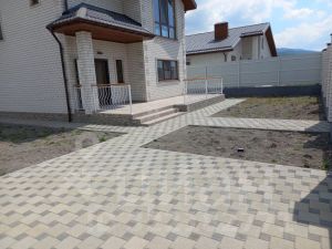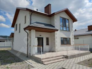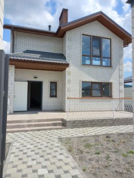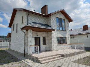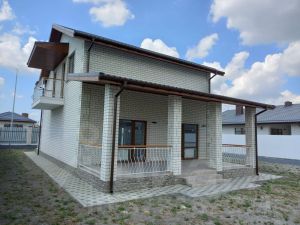 Облицовка белый кирпич (120 мм.). Цокольная часть обложена декоративным кирпичом. Материал крыши металлочерепица серого цвета.