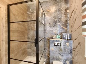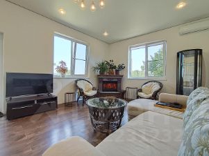 В доме: прихожая со скрытой лестницей на чердак, два санузла, три спальни, кухня-гостиная с выходом на террасу. Установлен двухконтурный газовый котёл, система теплый пол во всем доме кроме спален, сплит-системы, проведён интернет. В доме сделан новый ремонт, осталось поклеить обои в одной комнате и коридоре. В комнатах на полу качественный ламинат. В коридоре, на кухне в санузлах на полу керамогранит. Установлены натяжные потолки.