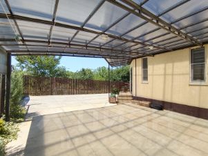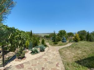 Ухоженный двор с растущими вечно зелеными кустарниками и деревьями. Плодоносящий сад: с разными сортами винограда, персика, нектарина, черешня, вишня, груша, слива, инжир, яблоня, шелковица, гранат и фундук.