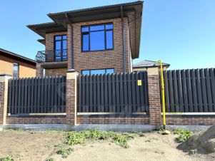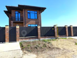 Участок огорожен по периметру забором, фасадный — кирпичные колонны, ворота откатные, калитка.