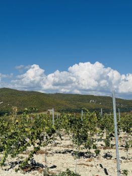 Напротив дома виноградники и горы, кот относятся к Абрау- Дюрсо, с другой стороны море