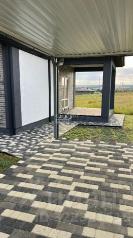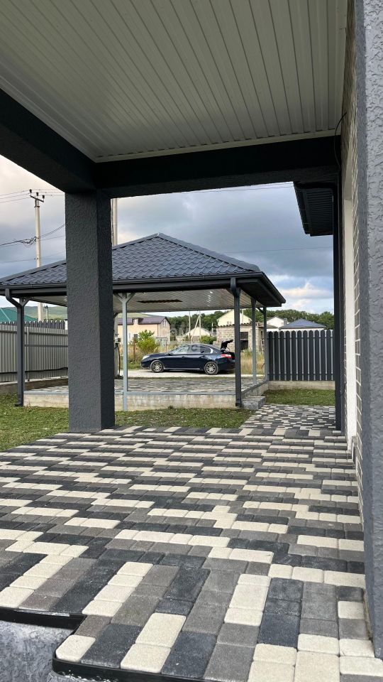 Отделка территории: Трехцветная тротуарная плитка с мраморной крошкой, установленная на прочное бетонное основание.