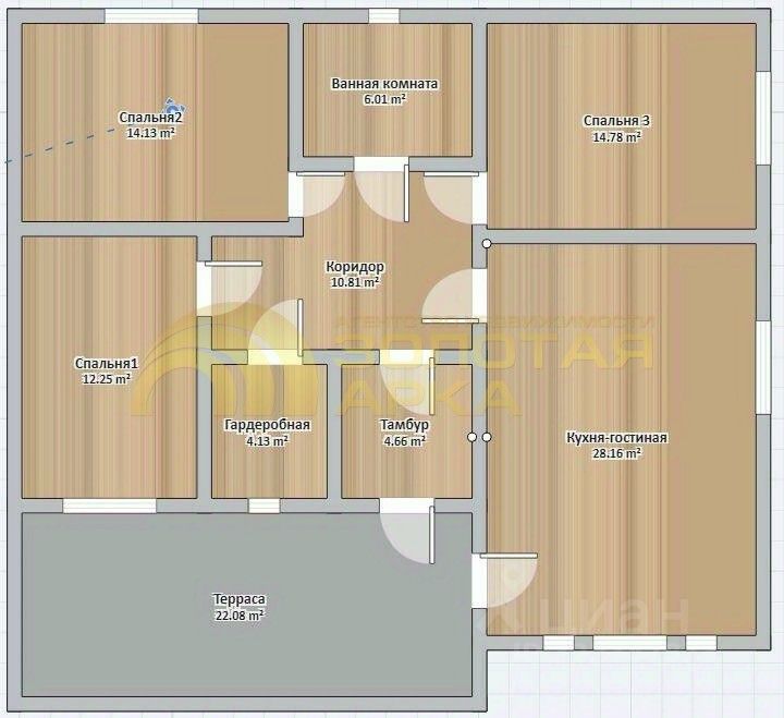 В доме 3 спальни, кухня - гостиная, гардеробная, санузел.