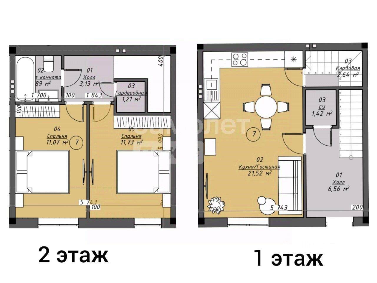 Общая площадь 68,8 кв м, кухня 21,52 кв м, 2 изолированных спальни.