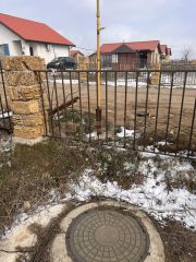 Фасадное ограждение: металлический кованный забор высотой 1200 мм, откатные ворота без автоматики.Забор из металлической сетки для плетущихся растений по меже.Придомовая территория: отмостка по периметру дома, автомобильная парковка и входная группа, выполненные из тротуарной плитки.