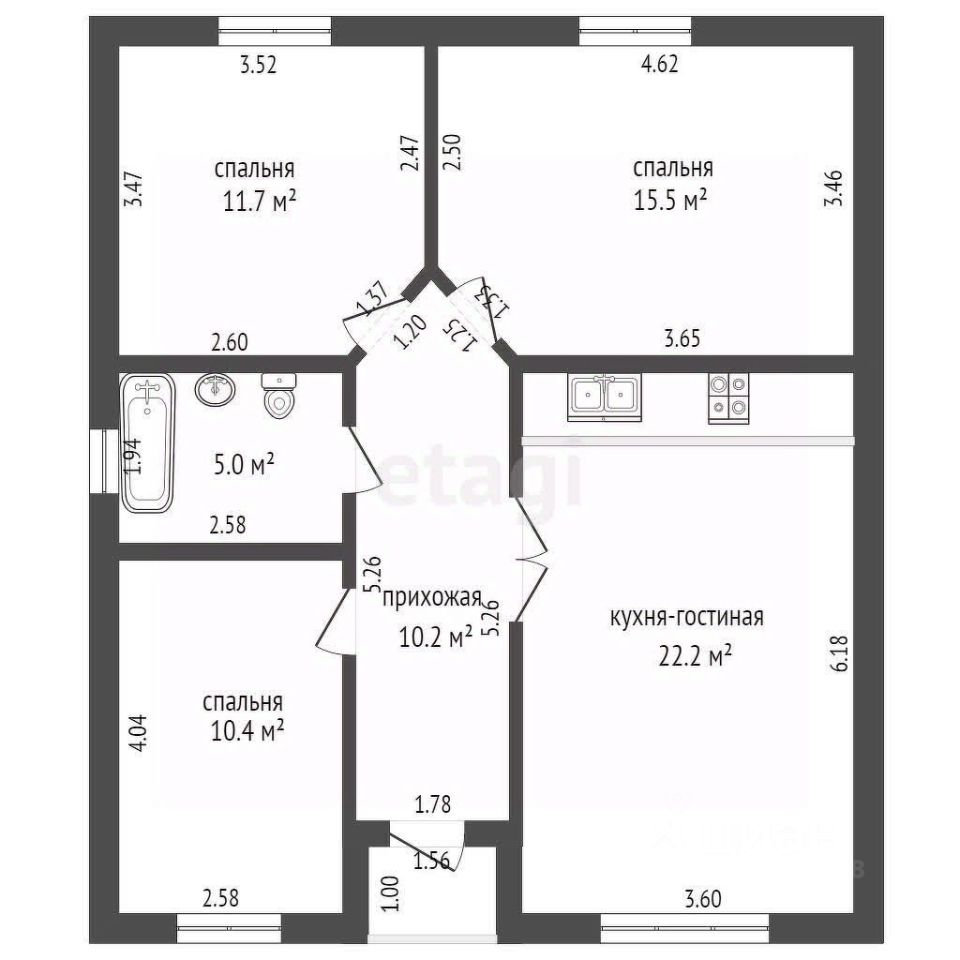 В доме большая кухня гостиная с большим витражным окном с выходом на задний двор. В доме 3 спальных комнаты по 16,7; 16; и 15,4 м2, сан. узел 10 кв. м. и прихожая 9 кв. м.