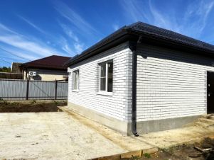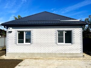 Одноэтажный коттедж возведен на свайно-ростверковом фундаменте, материал стен — газоблок, наружные — облицовочный кирпич, металлопластиковые окна, кровля — металлочерепица.