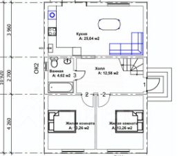На первом этаже 2 изолированные жилые комнаты по 13.26 кв.м, кухня- гостиная площадью 25.04 кв..м., с выходом на задний двор, второй этаж свободная планировка, туалет совмещенный.