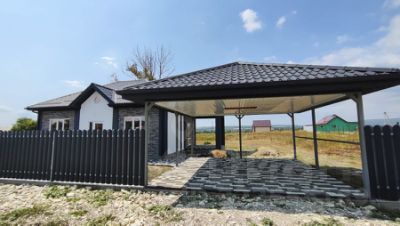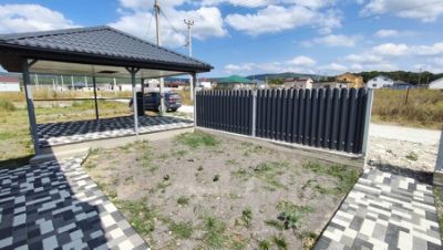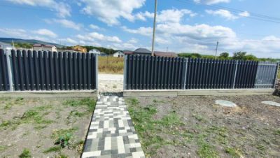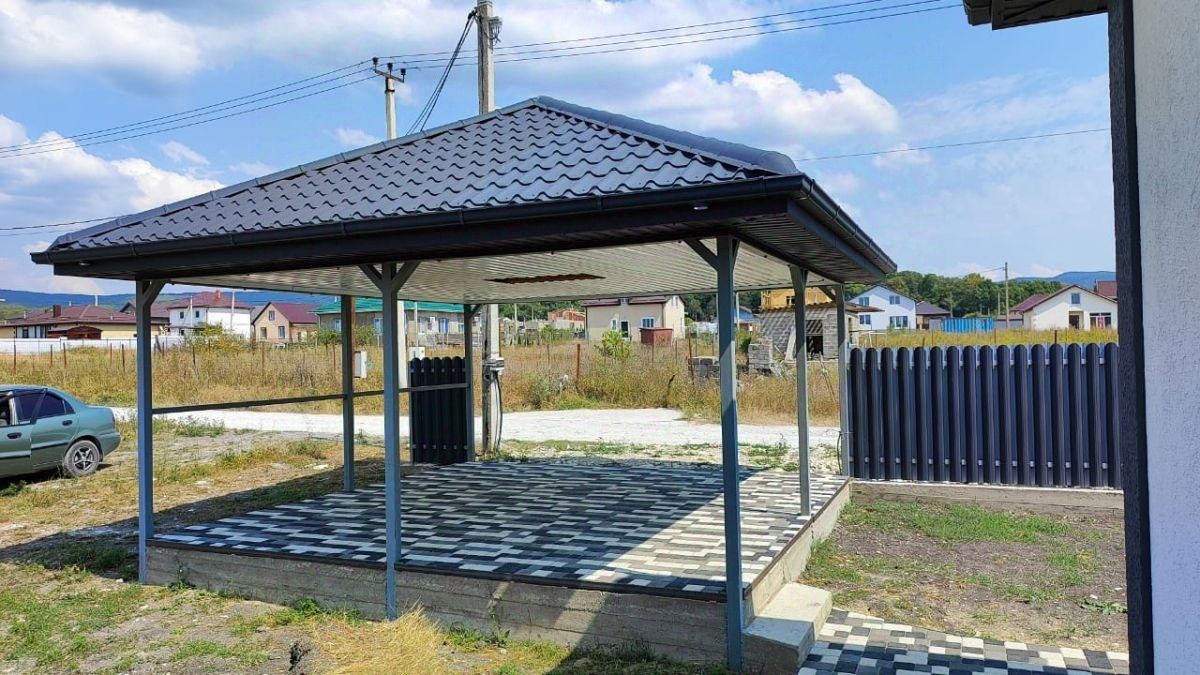 По фасаду двусторонний забор с воротами и калиткой, имеется место под два автомобиля с навесом.