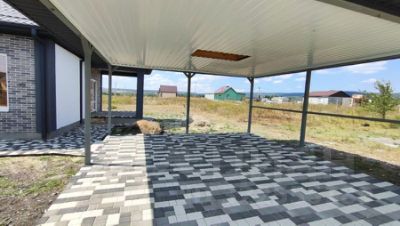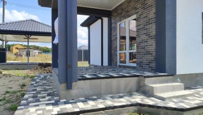 Тротуарная трехцветная плитка с мраморной крошкой уложена на полноценное бетонное основание по всей площади включая отмостку.ПОКУПАТЕЛЯМ: