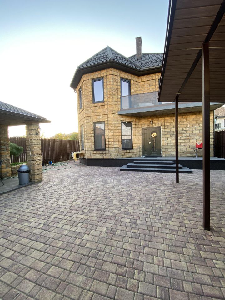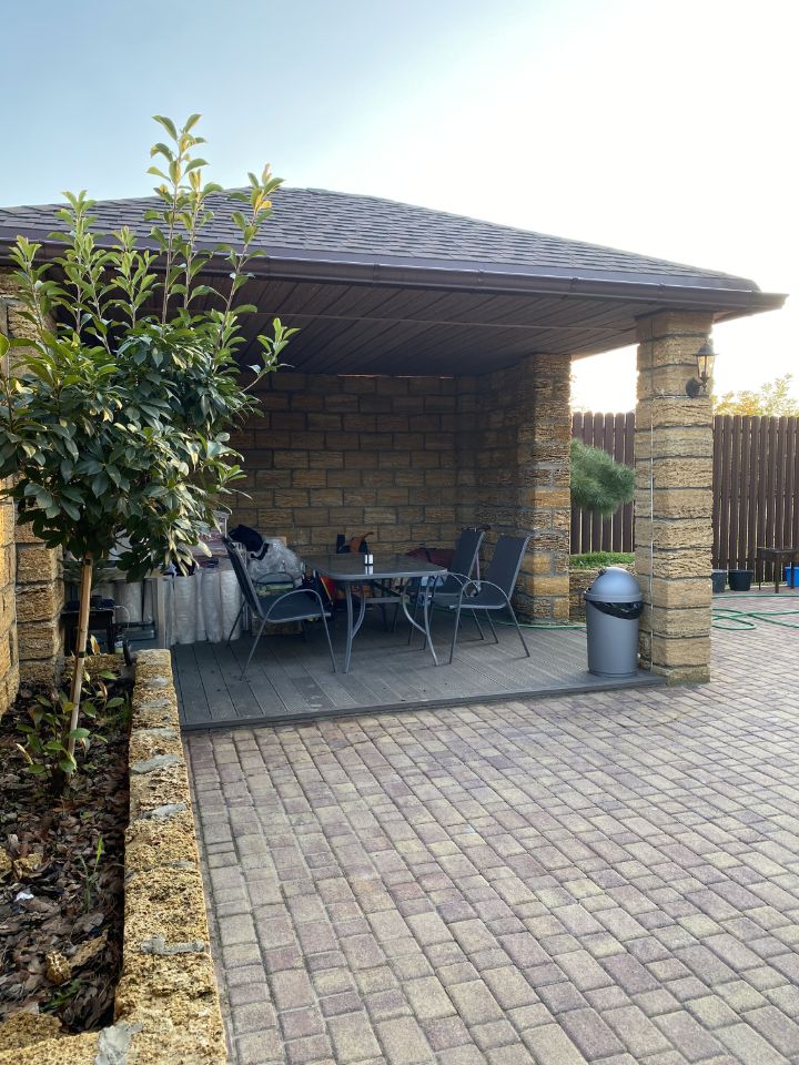 Двор полностью облагорожен , брусчатка , беседка , навес , электрические ворота .