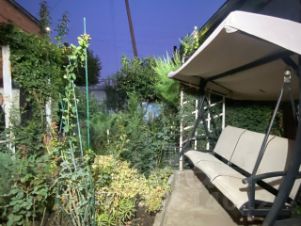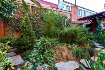 На участке много зелени и цветов, в том числе прекрасные розы!